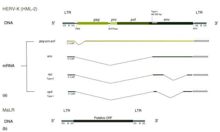 Најновата позната група на овие вирусни гени се нарекува LTR5Hs. Тие произлегле поради древни вирусни инфекции кои се појавиле кај заедничките предци на луѓето и големите мајмуни, во моментот кога таа линија се одвоила од мајмуните. Овие хумани ендогени ретровируси (HERVs) некогаш се сметале за бескорисен „генетски отпад“. Меѓутоа, денес се знае дека се тоа секвенци со потекло од ретровируси, вируси чиј генетски материјал е составен од РНК. Кога ретровирус ќе ја зарази клетката, ензим ја претвора РНК во ДНК, која потоа се вградува во геномот на таа клетка.