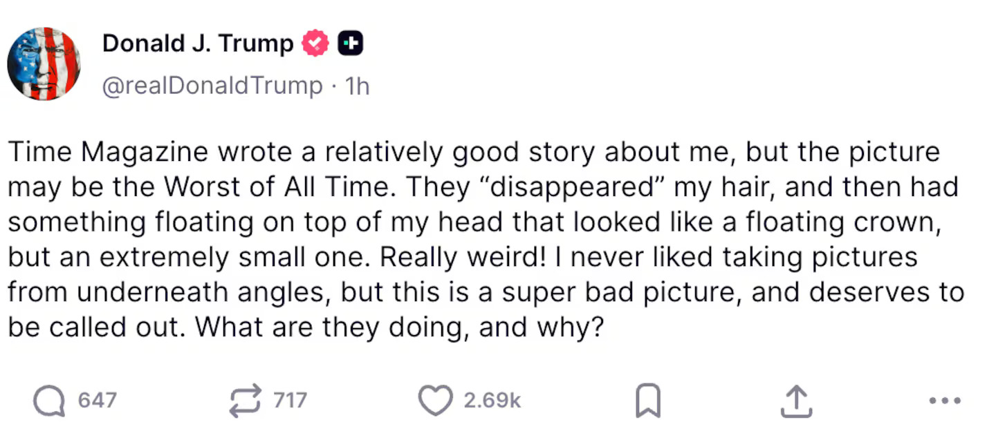 „Магазинот ‘Time’ напиша релативно добра сторија за мене, но фотографијата можеби е најлошата на сите времиња“, напиша Трамп на „Truth Social“.