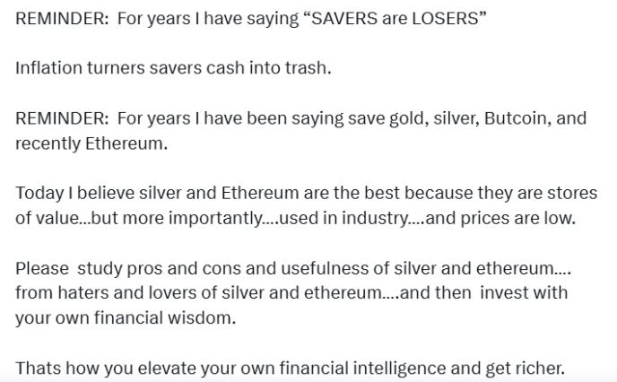 Верувам дека среброто и етериумот се најдобри затоа што не се само чувари на вредноста туку имаат и индустриска примена, а нивните цени сега се ниски“, напишал тој.