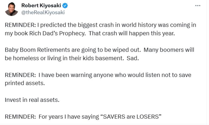 „Пензиите на „бејби бум“ генерациите ќе бидат избришани, многумина ќе oстанат дома или ќе живеат во подруми со своите деца. Тажно“, напишал Кијосаки во пораката која привлекла огромно внимание меѓу неговите следбеници.