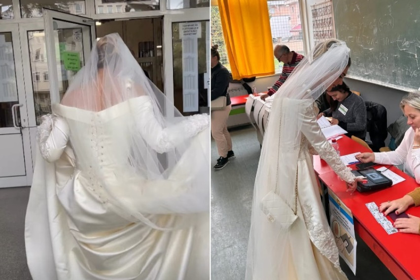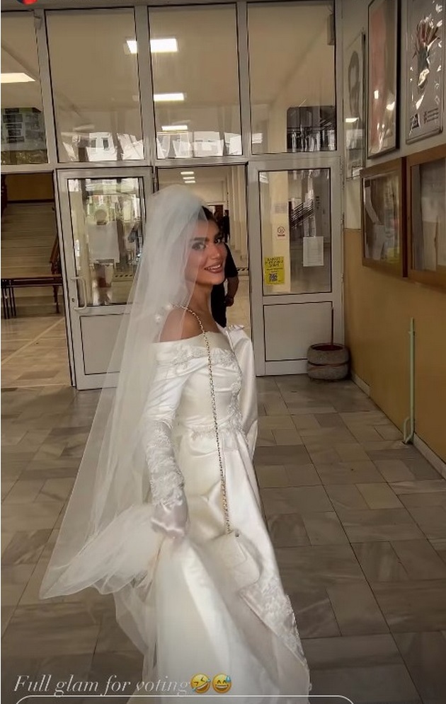 Во бела гламурозна венчаница, вел и комплетен невестински изглед, Сандра ги изненадила присутните на избирачкото место, покажувајќи дека личните свечености не се пречка за исполнување на граѓанските обврски.