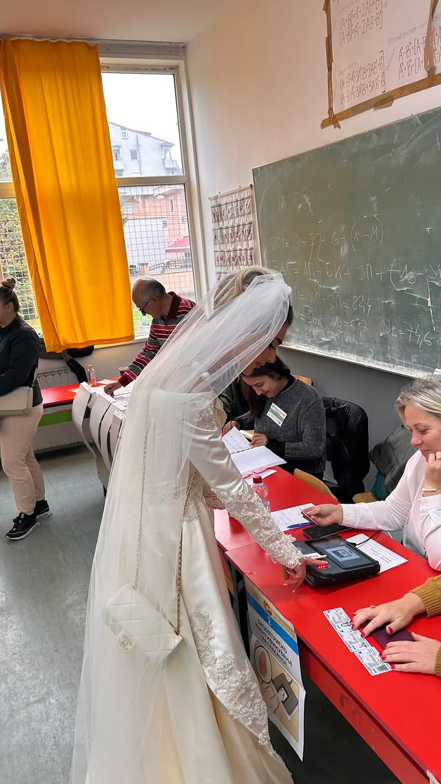 Во една несекојдневна сцена за изборните денови, невестата Сандра Матеска од Скопје, вчера облечена во венчаница и во придружба на младоженецот го искористи своето гласачко право пред да продолжи со свадбената прослава.