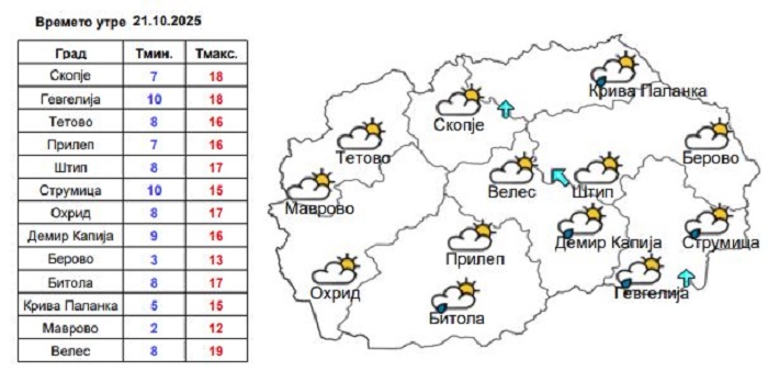 Утринските температури ќе се движат од 2 Целзиусови степени во Маврово, до 10 степени во Струмица и Гевгелија.