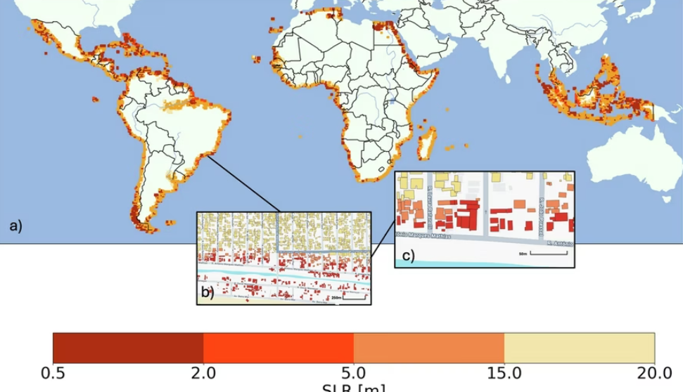 Студија објавена во магазинот „Urban Sustainability“, анализирала 840 милиони згради во три сценарија со пораст на нивото на морето: 0,5 метри, 5 метри и 20 метри.