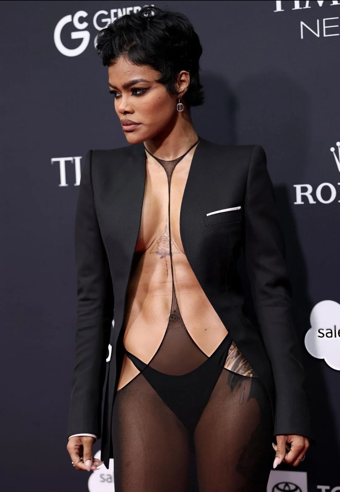 Под фустанот носела само црна танга, а градите ги покрила со елегантно, црно сако. Тејана ја комплетирала црната комбинација со темна и впечатлива шминка и со кратка пикси фризура.