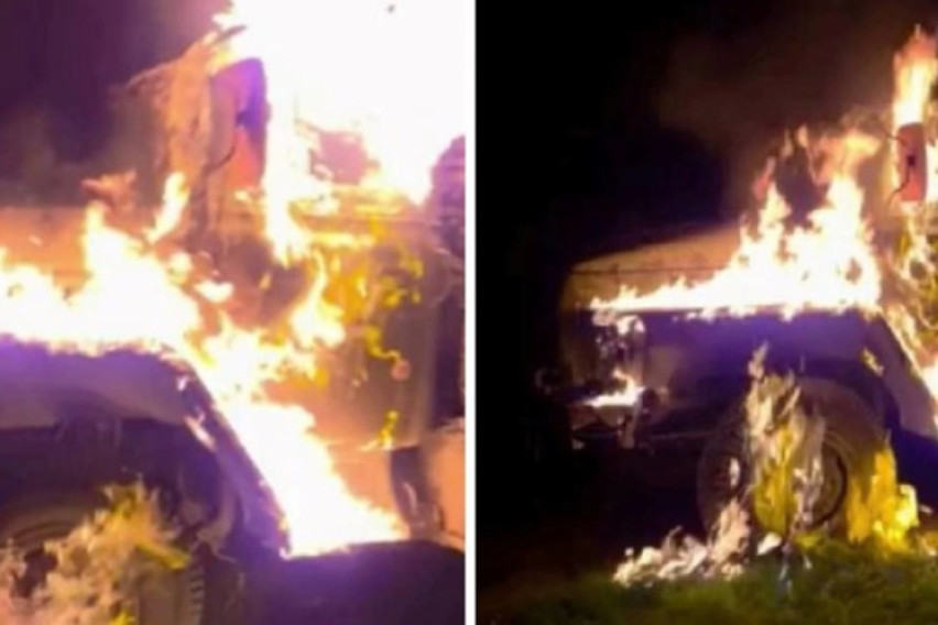 Видеото, снимено без нарација, покажува лице како пали запалива супстанција на руски воен камион со прорускиот воен симбол „З“ насликан на неговата врата.