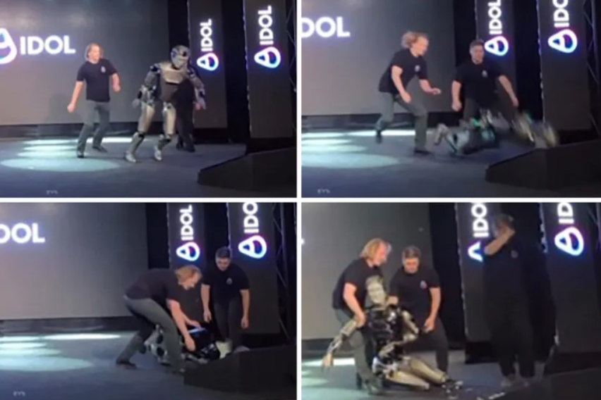 Роботот се појави на сцената со култната музика од филмот „Rocky“, но ентузијазмот траеше само неколку секунди. „AIdol“ веднаш почна да се ниша како пијан човек, ја изгуби рамнотежата, падна и зад себе остави неколку делови разфрлани по подиумот. Публиката остана збунета, а организаторите веднаш реагираа — додека неговите придружници го изнесуваа од сцената, техничарите трчаа да го скријат од погледите на присутните.
