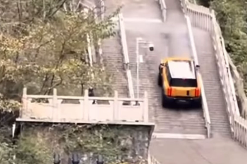 Снимката од земја го прикажува „Fulwin X3L“, новиот хибриден теренец, како успева да се искачи до половина од стрмните скалило пред да почне да се мачи. Возачот продолжува да ја гази педалата за гас обидувајќи се да стигне до следната платформа, но автомобилот почнува да се лизга наназад по скалите и удира во голем дел од заштитната бариера, фрлајќи фрагменти над работ на карпата.