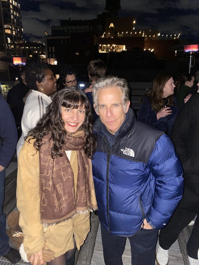 [Тамара Котевска со познатиот актер Бен Стилер, кој во моментов интензивно се занимава со документаристика. Тој на забавата на Cinetic Media изјави дека го обожава филмот Honeyland, бидејќи тоа е еден од последните филмови што неговиот долгогодишен продуцент му ги препорачал да ги погледне пред да почине].