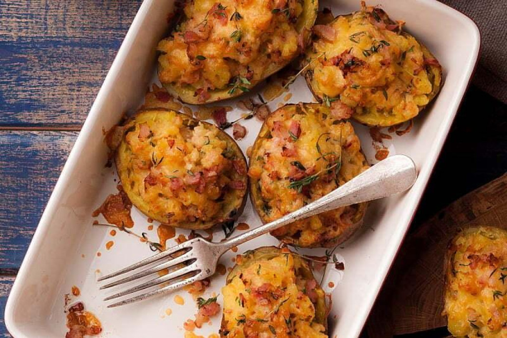 Прво измијте ги компирите и нелупени печете ги цели во рерна на 200°C околу 40 минути, додека не омекнат. Потоа исечете ги на половинки и внимателно издлабете ја средината, оставајќи раб дебел околу еден сантиметар. Издлабениот внатрешен дел зачувајте го за филот.