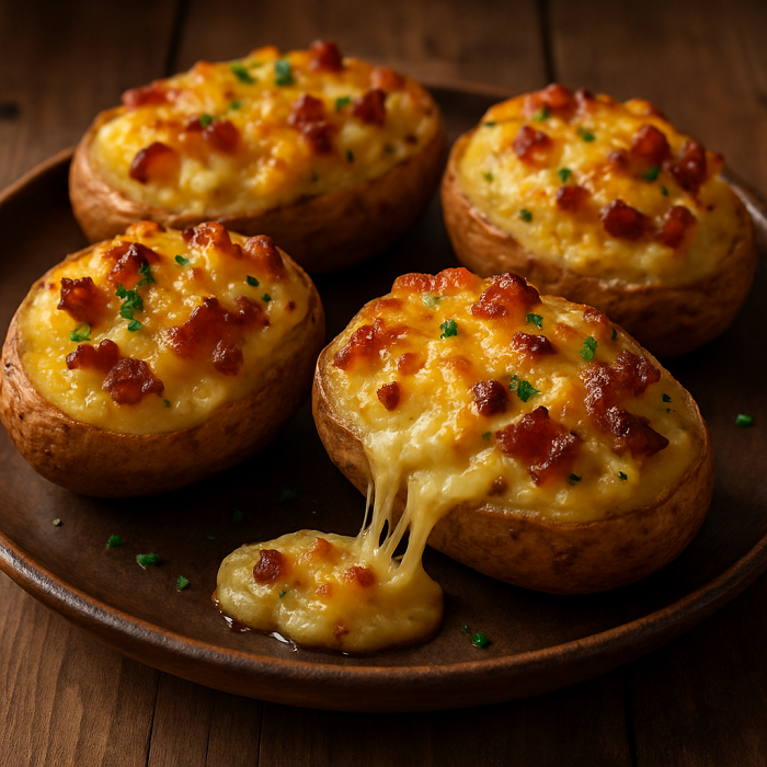 Наполнете ги половинките компири со подготвениот фил, наросете со преостанатиот кашкавал и печете уште 10-15 минути додека кашкавалот не се стопи и не добие златно-кафена боја.