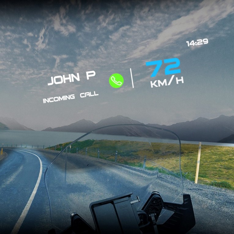 Нано "OLED" проектор ја проектира брзината, навигациските инструкции, дојдовните повици и предупредувања за полициски радар во видното поле на возачот – на растојание што, според компанијата, одговара на околу три метри пред мотоциклистот. Нема повеќе гледање надолу кон инструментите или пребарување по мобилниот телефон. Податоците се прикажани токму таму каде што веќе гледате.