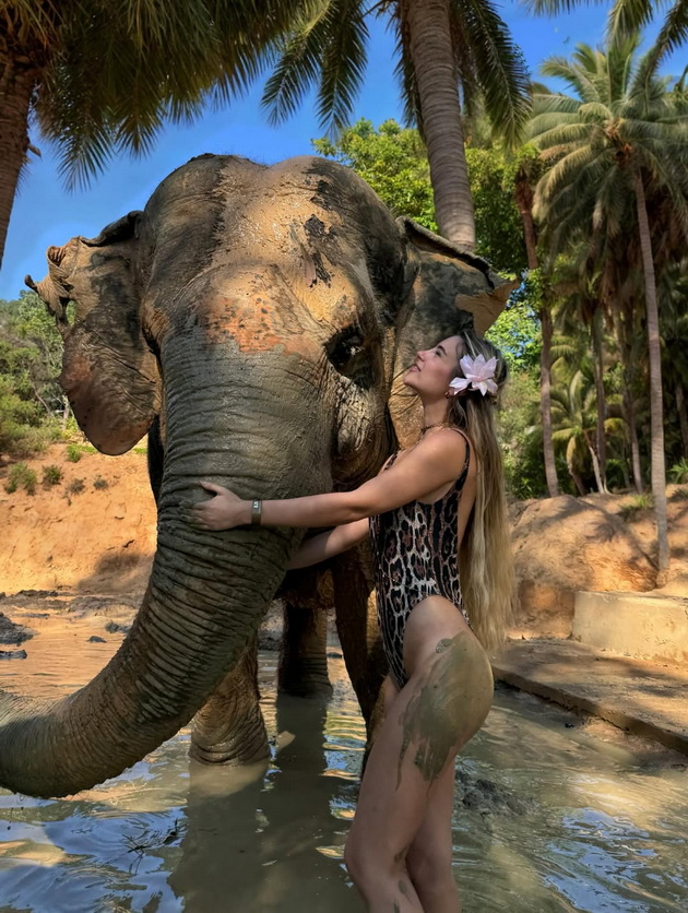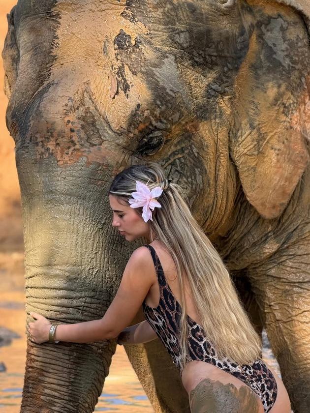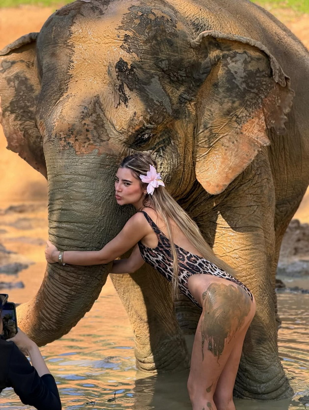 Најголем интерес сепак привлече моментот кога инфлуенсерката позираше во кал, прегрнувајќи слон во засолниште за животни. Видно разнежнета, таа напиша дека слоновите ѝ станале омилен дел од патувањето, а во шега додаде дека би сакала „да си понесе една слоница дома“.