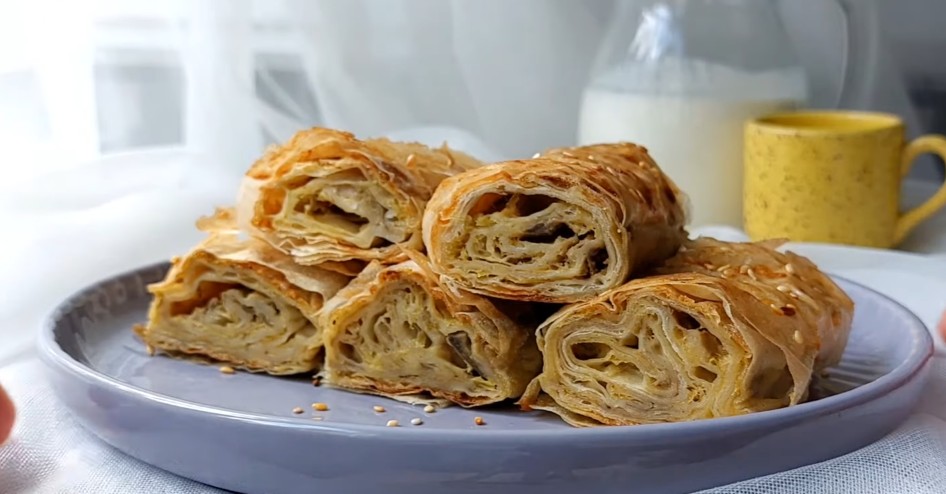 По желба, пред крај додајте ситно сечкан лук. Корите за пита напрскајте ги со вода, распоредете го филот и виткајте во ролати, па наредете ги во плех малку напрскан со вода.