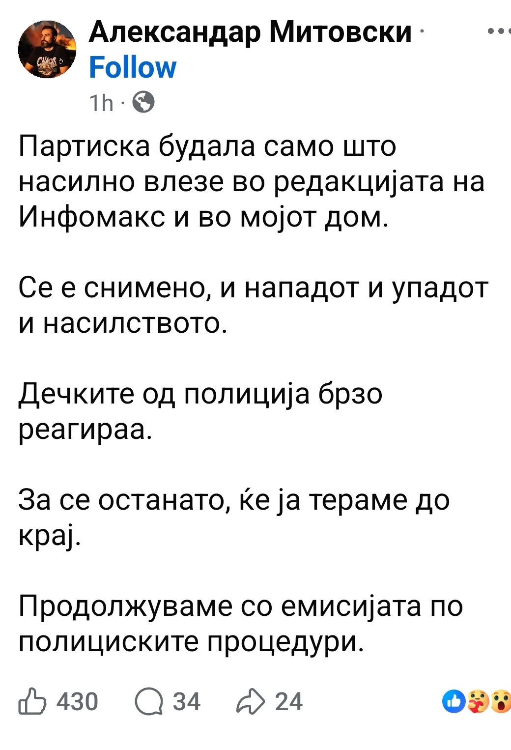 „Партиска будала само што насилно влезе во редакцијата на „Инфомакс“ и во мојот дом. Сè е снимено, и нападот и упадот и насилството. Дечките од полиција брзо реагираа. За сè останато, ќе ја тераме до крај. Продолжуваме со емисијата по полициските процедури.“