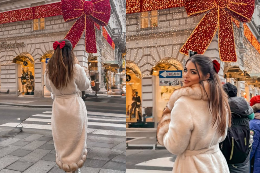 Фотографиите се направени на една од најпознатите виенски улици, украсена со светилки и огромна црвена машна, што дополнително ја засилува празничната и магична атмосфера. Со префинет стил и природна елеганција, таа успева да ја долови романтиката на градот, оставајќи впечаток на смиреност, самодоверба и присуство.