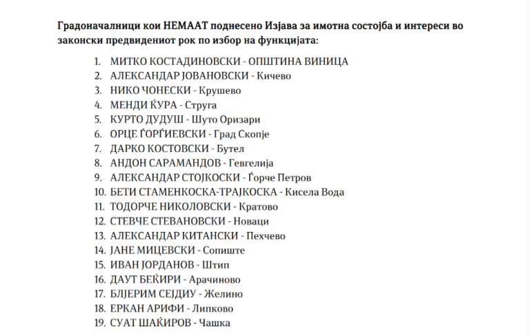 – 19 лица по изборот на функцијата – градоначалник, немаат поднесено изјава за имотна состојба и интереси,