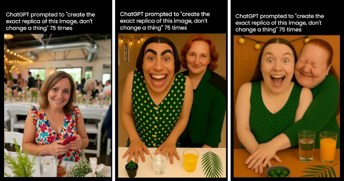 Задачата била крајно едноставна: „ChatGPT“ добил упатство совршено да рекреира фотографија, без никакви промени. Откако го направил тоа, ја добил истата задача повторно. И повторно. И повторно, и така 75 пати по ред. Во првите итерации, резултатот бил речиси идентичен со оригиналот – чист портрет, препознатливи бои, пропорции и изрази на лицето. Но, со текот на рекреирањето сликата полека, но видливо почнала да се менува.