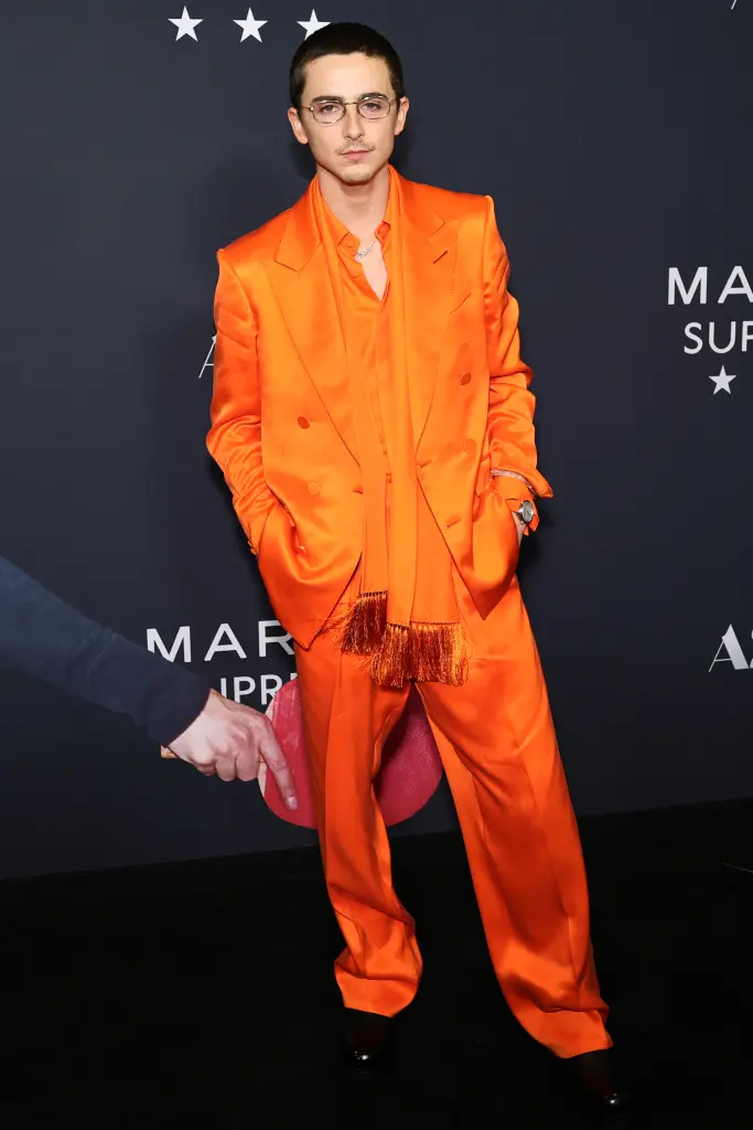 Шаламе носел портокалов костум на дизајнерот Хајдер Акерман за Том Форд, во комбинација со шал со реси, ланче, часовник и очила со тенка рамка.