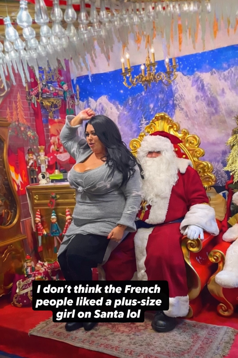 Додека Алекс седела во скутот на Дедо Мраз, минувачите ја гледале со изрази на „згрозеност“. „Мислам дека на Французите не им се допадна плус-сајз девојка на Дедо Мраз хаха“, рекла таа.