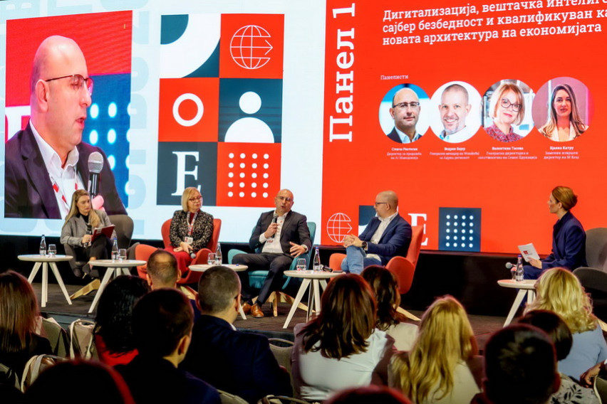 Првиот панел беше посветен на дигитализацијата, вештачката интелигенција, сајбер безбедноста и човечкиот капитал, отворајќи ја дебатата за тоа како технологијата веќе ја редефинира економијата и начинот на кој работат компаниите. Во дискусијата учествуваа Стевчо Ристески, директор за продажба на A1 Телеком, Бјанка Катру, заменик-извршен директор на М Кеш, Валентина Тасева, генерален директор и сопственичка на Семос Едукација, и Ведран Бајер, менаџер на Wonderful за Адриа регионот. Панелистите понудија различни, но комплементарни перспективи за иднината на бизнисот во дигиталната ера, како и за трансформацијата на пазарот на труд во услови на нови вештини и работни позиции креирани од вештачката интелигенција.
