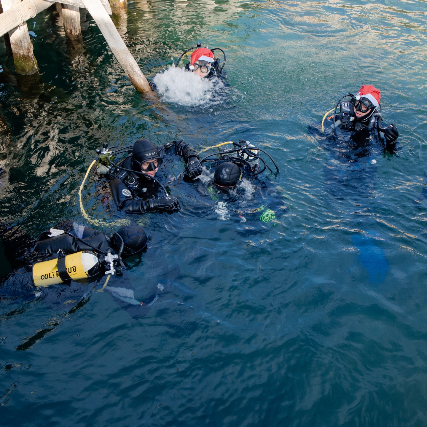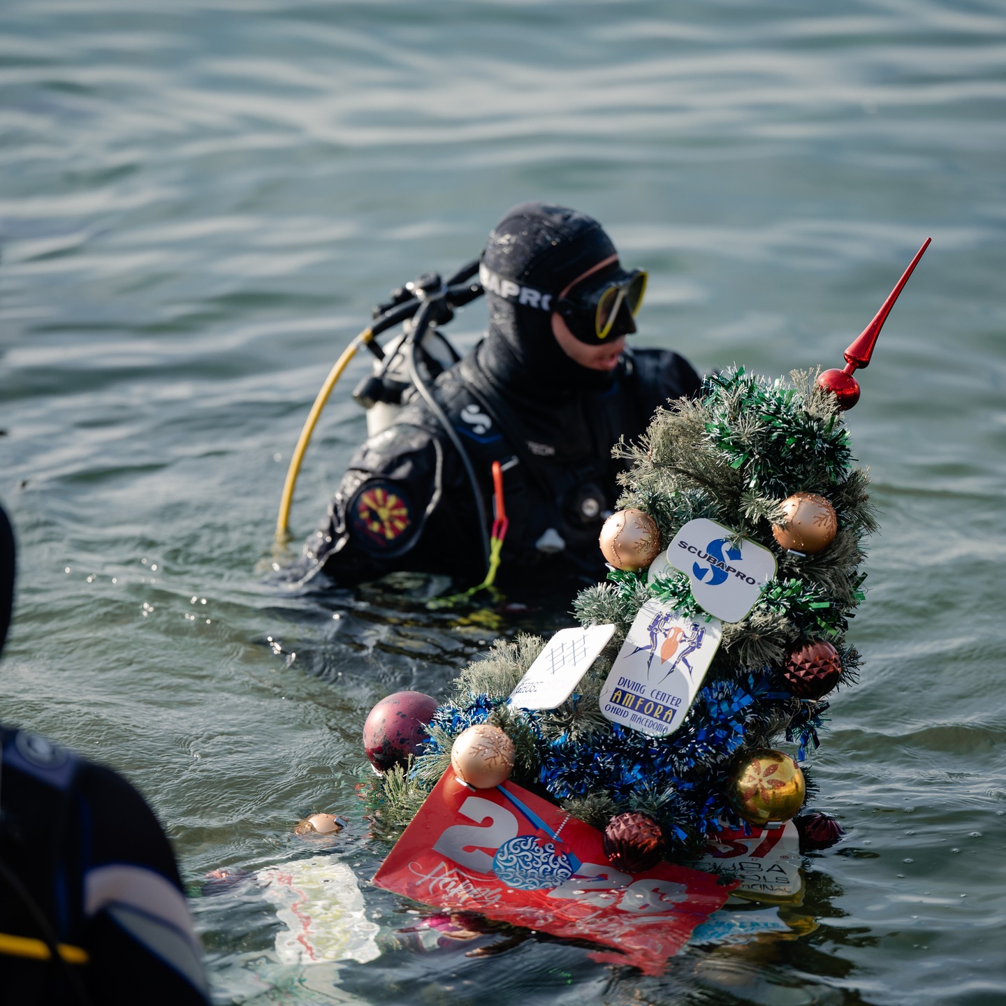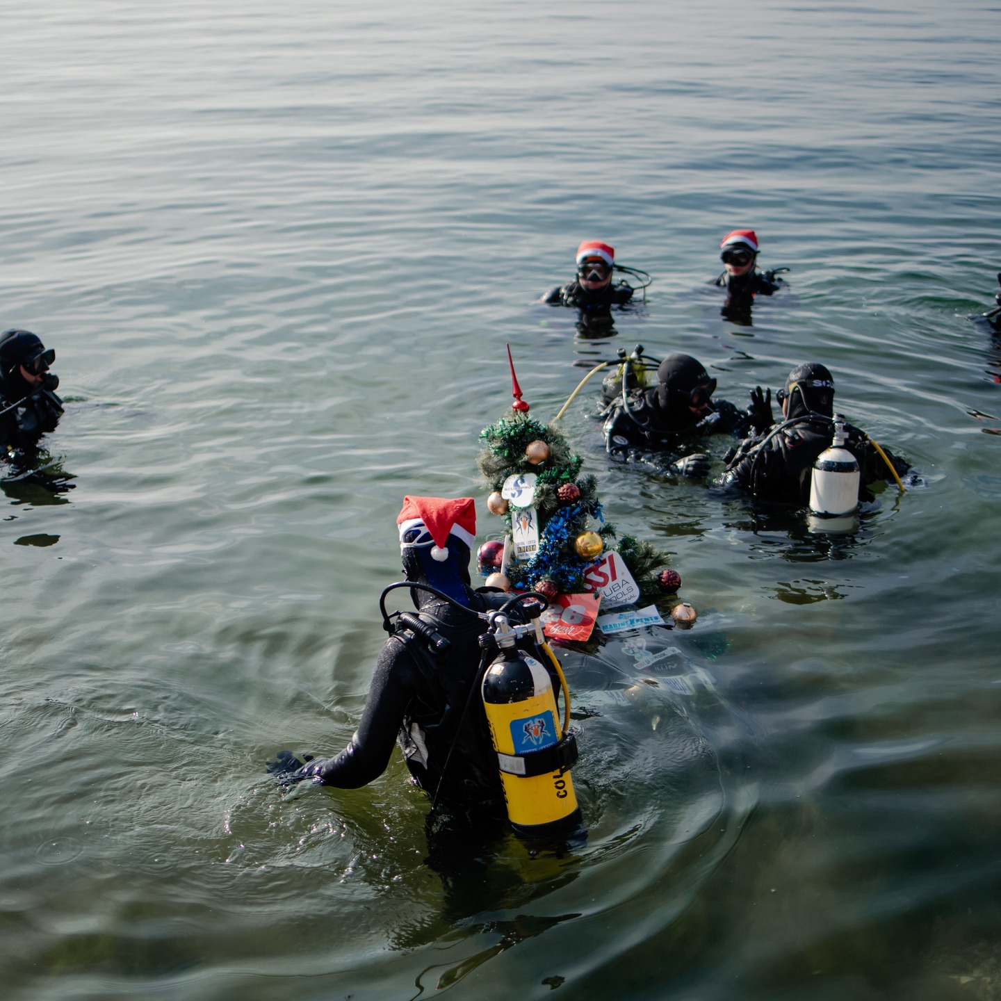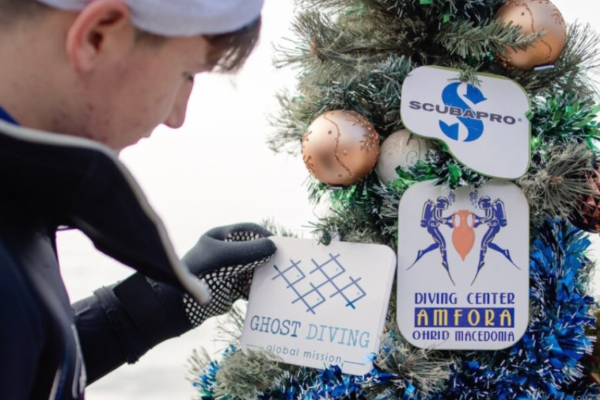 Новогодишната елка под вода ја поставиле нуркачи од нуркачкиот центар „Амфора“ во соработка со Здружението за ретки болести и со поддршка на волонтерите на Црвениот Крст од Охрид.