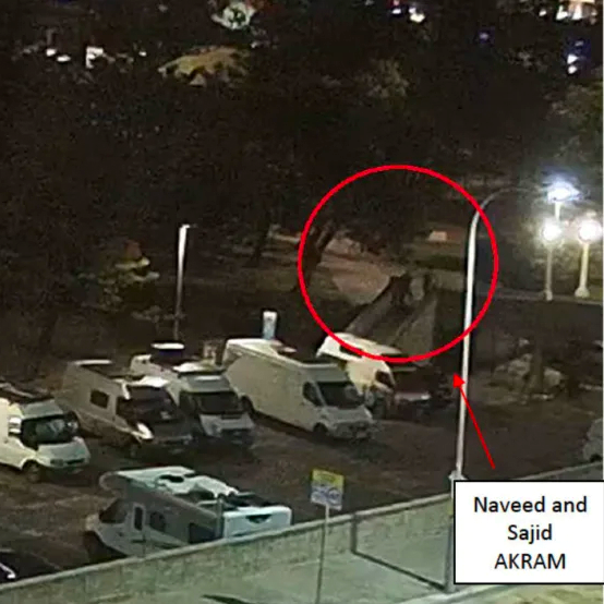 Судскиот досие, исто така, вклучува снимки од Саџид Акрам (50) и неговиот син Навид Акрам (24), како држат пушки и се движат на начин што укажува на тактичка обука.