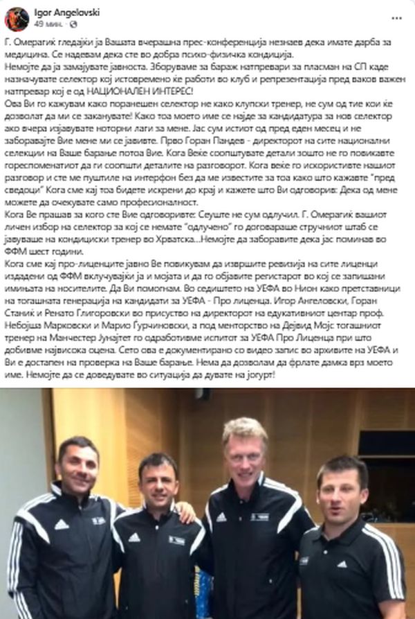 – Г. Омерагиќ гледајќи ја Вашата вчерашна прес-конференција незнаев дека имате дарба за медицина. Се надевам дека сте во добра психо-физичка кондиција. Немојте да ја замајувате јавноста. Зборуваме за бараж натпревари за пласман на СП каде назначувате селектор кој истовремено ќе работи во клуб и репрезентација пред ваков важен натпревар кој е од НАЦИОНАЛЕН ИНТЕРЕС!
