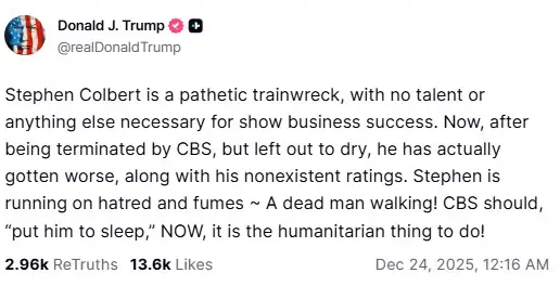 На Бадник, додека се емитуваше реприза од емисијата на Колберт, првично прикажана на 8 декември, американскиот претседател на својата социјална платформа „Truth Social“ напиша дека „CBS“, телевизиската мрежа што ја емитува емисијата на Колберт, „треба веднаш да го ‘успие’“ водителот, додавајќи дека тоа би било „хуманитарна работа што треба да се направи“.