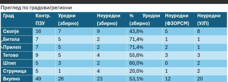 „Најнизок степен на уредност има во Струмица, каде што од пет контролирани установи, само една е со уредни наоди, а четири со неуредни. Со висока неуредност е и Скопје, каде што од 16 контролирани установи, седум се уредни, а девет се неуредни. Највисок степен на уредност имаат установите во Битола и Прилеп, каде 70 отсто се со уредни наоди“,