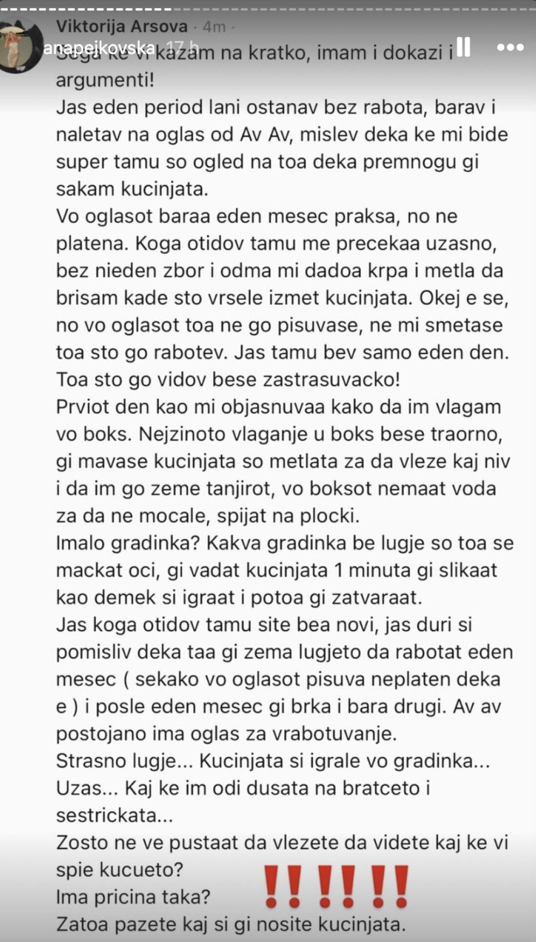 Сведоштво јавно објави и Викторија Арсова, која тврди дека поминала еден ден на пракса во пансионот и таму затекнала, како што наведува, сериозно загрижувачки услови. Таа пишува дека кучињата биле сместени во боксови без вода, спиеле директно на плочки, а излегувањето надвор било краткотрајно и главно служело за фотографирање за социјалните мрежи. Арсова тврди и дека била сведок на груб однос кон животните, при што тие биле удирани со метла за да се придвижат назад во боксовите.