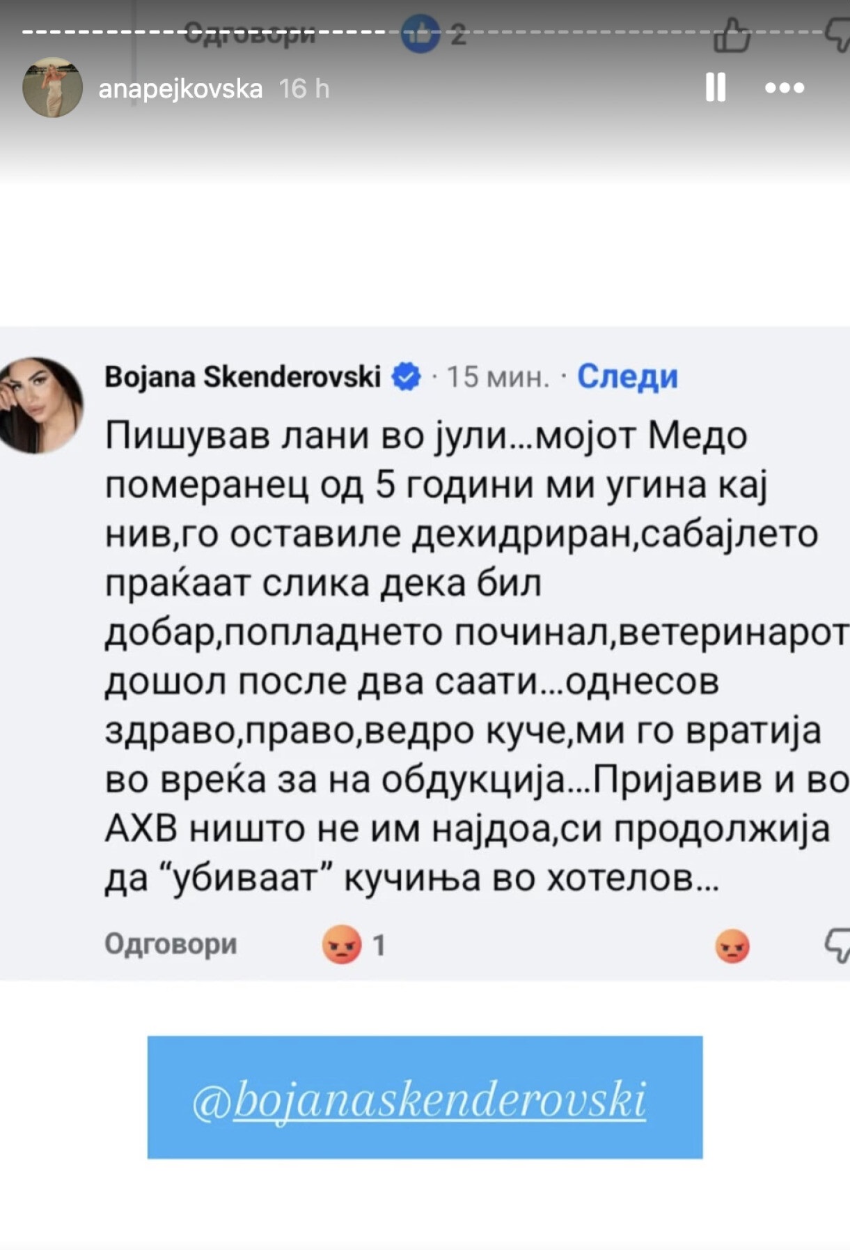 По повод целата ситуација се огласи и пејачката Бојана Скендеровски, која напиша дека го оставила својот померанец на чување во пансионот, но тој угинал откако го оставиле дехидриран. Вели дека пријавила во АХВ, но пансионот продолжил да работи.