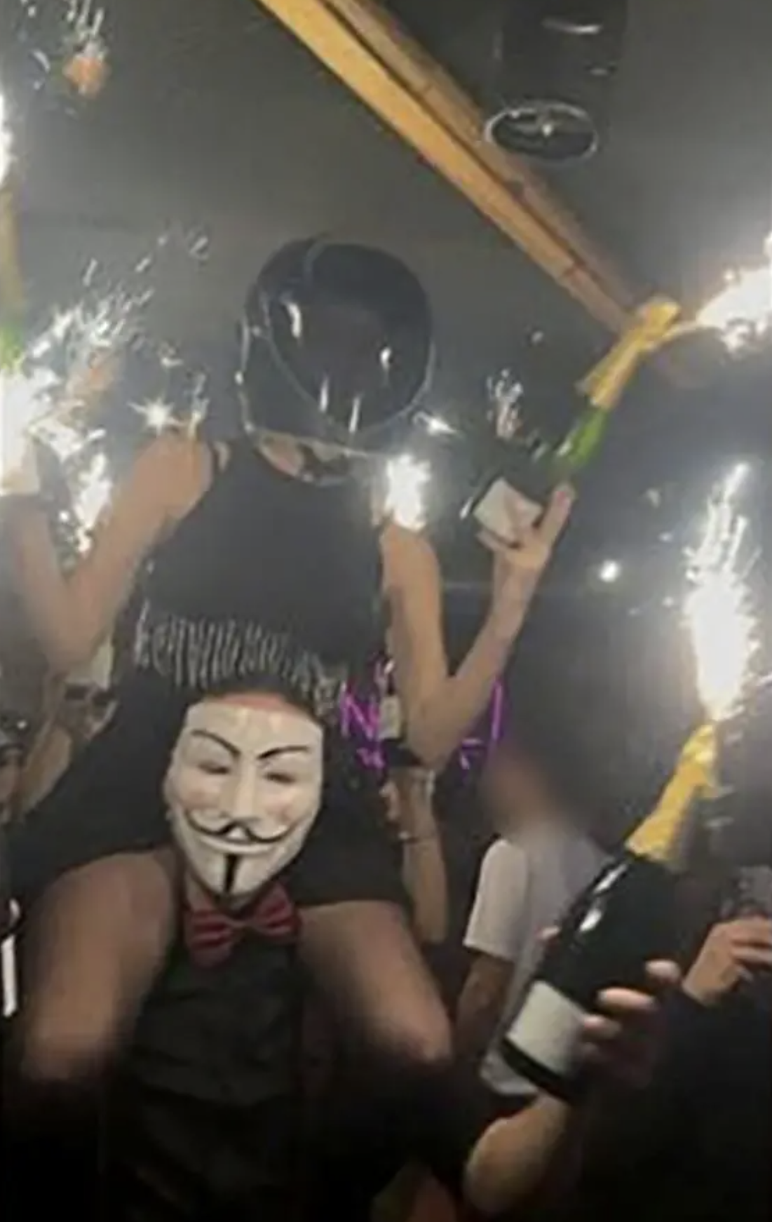 Овие „прскалки“, според неколку сведоци на настанот, можеби се причината за пожарот на таванот на барот и ужасот во кој загинаа најмалку 47 лица. На првата фотографија, направена во подрумот на барот, две лица држат шишиња шампањ со мал огномет.
