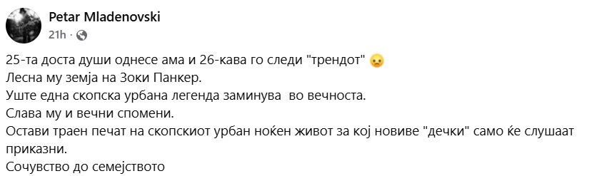 „И Зоки Панкер Тодоровски се одјави. Скопска и угостителска легенда кој знаеше скопски да го живее секојдневието на градов, кој се повеќе го губи шармот.