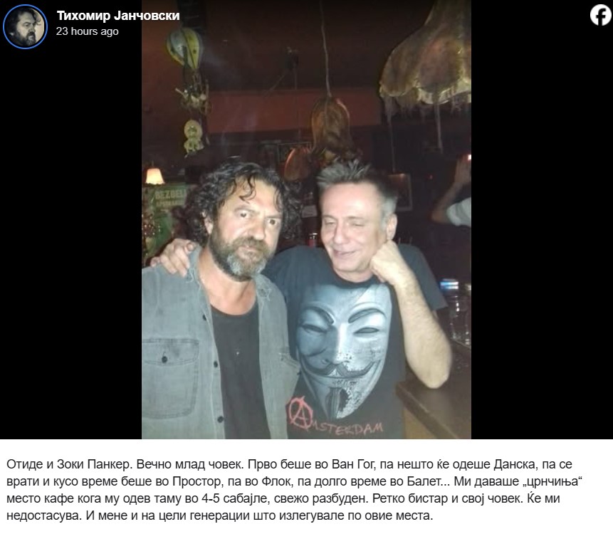 „Отиде и Зоки Панкер. Вечно млад човек. Прво беше во Ван Гог, па нешто ќе одеше Данска, па се врати и кусо време беше во Простор, па во Флок, па долго време во Балет... Ми даваше „црнчиња“ место кафе кога му одев таму во 4-5 сабајле, свежо разбуден. Ретко бистар и свој човек. Ќе ми недостасува. И мене и на цели генерации што излегувале по овие места“, напиша Тихомир Јанчовски.