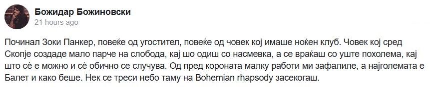 „Починал Зоки Панкер, повеќе од угостител, повеќе од човек кој имаше ноќен клуб. Човек кој сред Скопје создаде мало парче на слобода, кај шо одиш со насмевка, а се враќаш со уште поголема, кај што сѐ е можно и сѐ обично се случува.