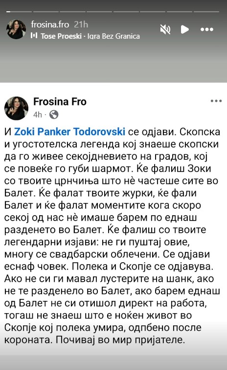 Ќе фалиш Зоки со твоите црнчиња што нè частеше сите во Балет. Ќе фалат твоите журки, ќе фали Балет и ќе фалат моментите кога скоро секој од нас нè имаше барем по еднаш разденето во Балет. Ќе фалиш со твоите легендарни изјави: Не ги пуштај овие, многу се свадбарски облечени. Се одјави еснаф човек. Полека и Скопје се одјавува“, напиша Фросина Фро.