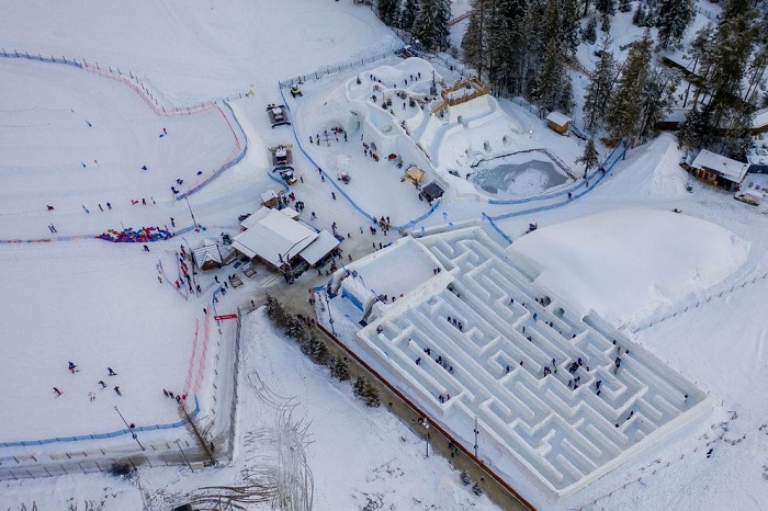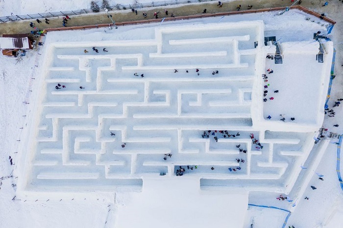 Лавиринтот е изграден од 60.000 блокови набиен снег, исто како што се градат иглоата, а посетителите можат да се „изгубат“ во лавиринтот околу еден час.