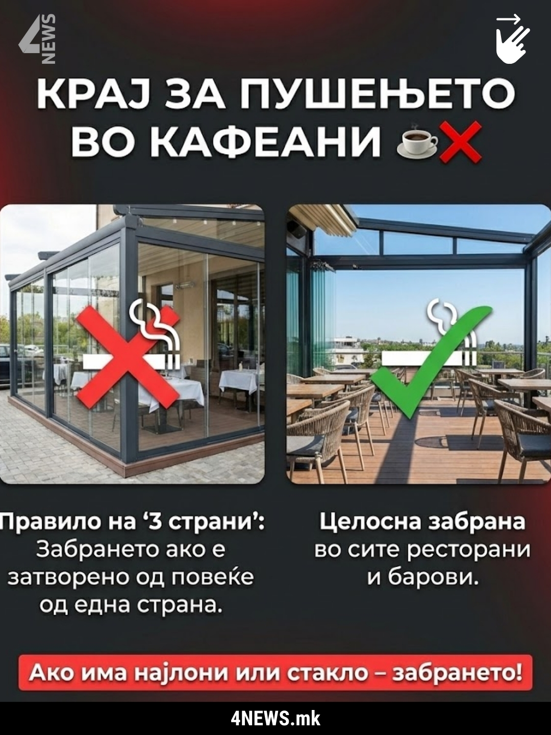 Една од клучните новини се однесува на угостителството, каде што се планира целосно укинување на пушењето во сите затворени простори, без исклучок – од ресторани и кафулиња до барови и традиционални меани. Како дополнување, се воведува таканареченото правило на три отворени страни за терасите. Според ова правило, пушењето ќе биде дозволено само на тераси кои се целосно отворени од најмалку три страни, со што практично се укинува долгогодишната практика на нивно затворање и застаклување во текот на зимските месеци.