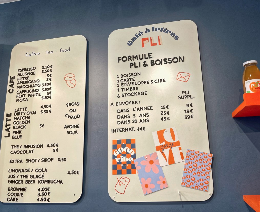 „Café Pli“ е прво кафуле од ваков тип во Европа, инспирирано од Нулдам Спејс, кафуле со сличен концепт во Сеул, Јужна Кореја. Се наоѓа на улицата „38 rue du Faubourg du Temple“ во 11-тиот арондисман во Париз. Го основала Женевјев Ландсман во јули 2024 година. Посетителите можат да изберат од различниот прибор за пишување како што се пликови, разгледници, налепници, моливи, пенкала и восок за запечатување и да напишат писмо до себе или до некој друг, кое ќе биде испратено во иднина. Запечатените пликови потоа се ставаат во отвор за секој ден од годината; вие едноставно го избирате датумот кога сакате да биде испратено вашето писмо, а персоналот на „Café Pli“ ќе се погрижи за останатото.