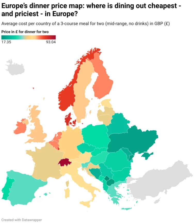 Швајцарија е на врвот на листата, со просечна вечера од три јадења за двајца што чини 107,24 евра. По неа следат Данска (93,69 евра), Луксембург (90 евра) и Норвешка (89,86 евра).