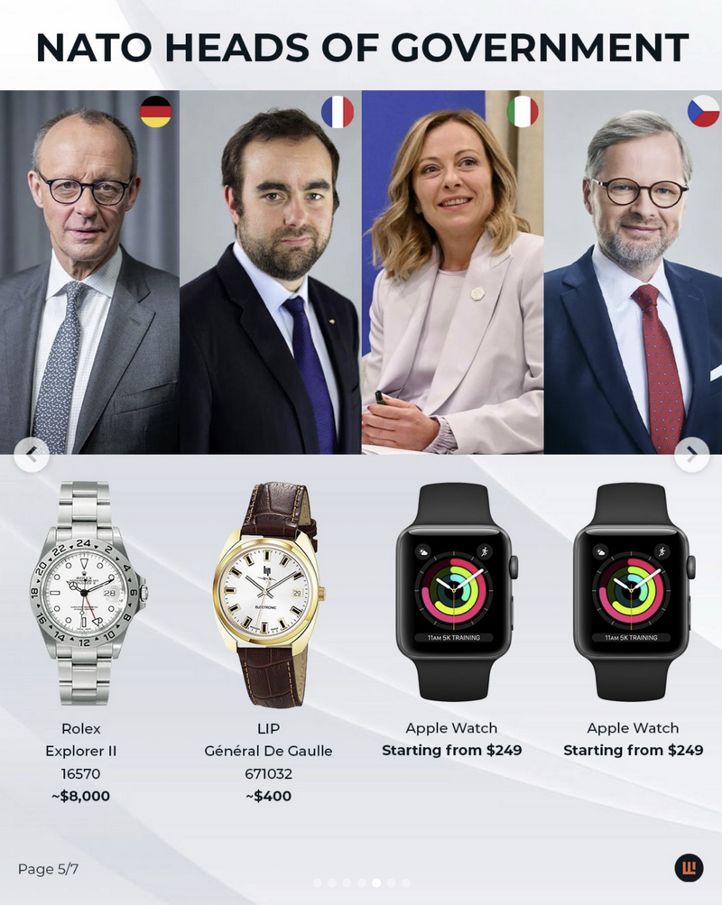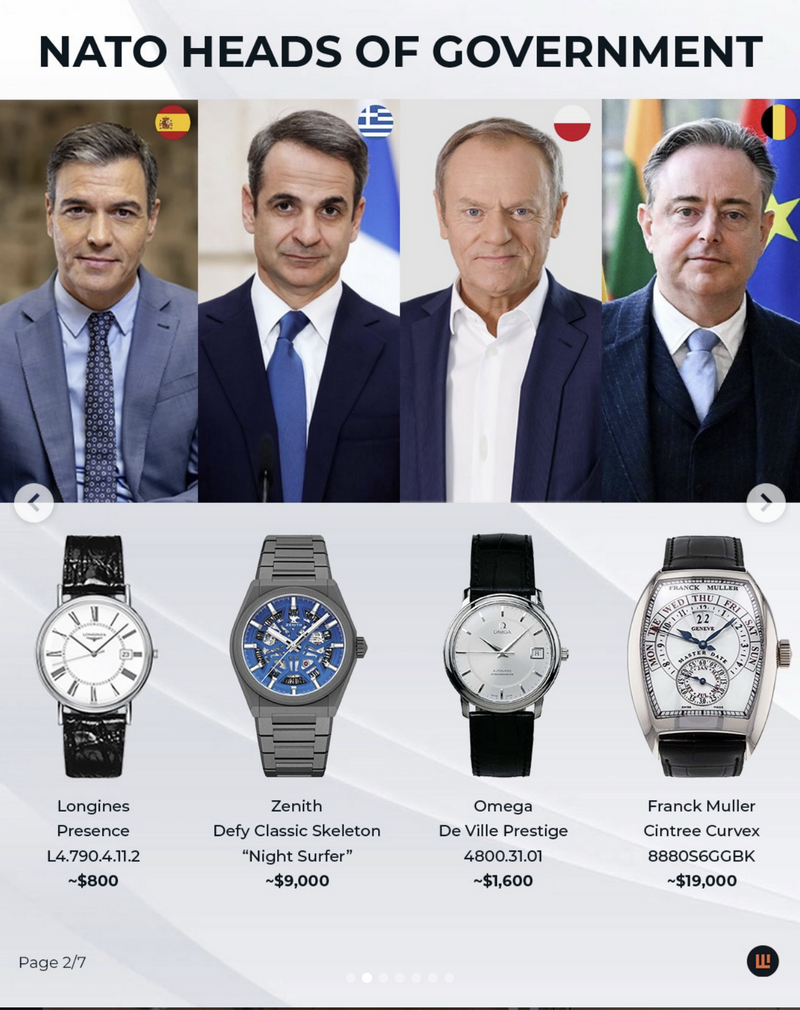 Во истото истражување, IFLW наведува дека изборите на часовници кај НАТО лидерите значително варираат – од луксузни брендови како Vacheron Constantin и Montblanc, до попристапни и практични модели од Tissot, Hamilton и Skagen. Токму тоа, според порталот, покажува дека часовникот е личен избор, а не само симбол на статус.