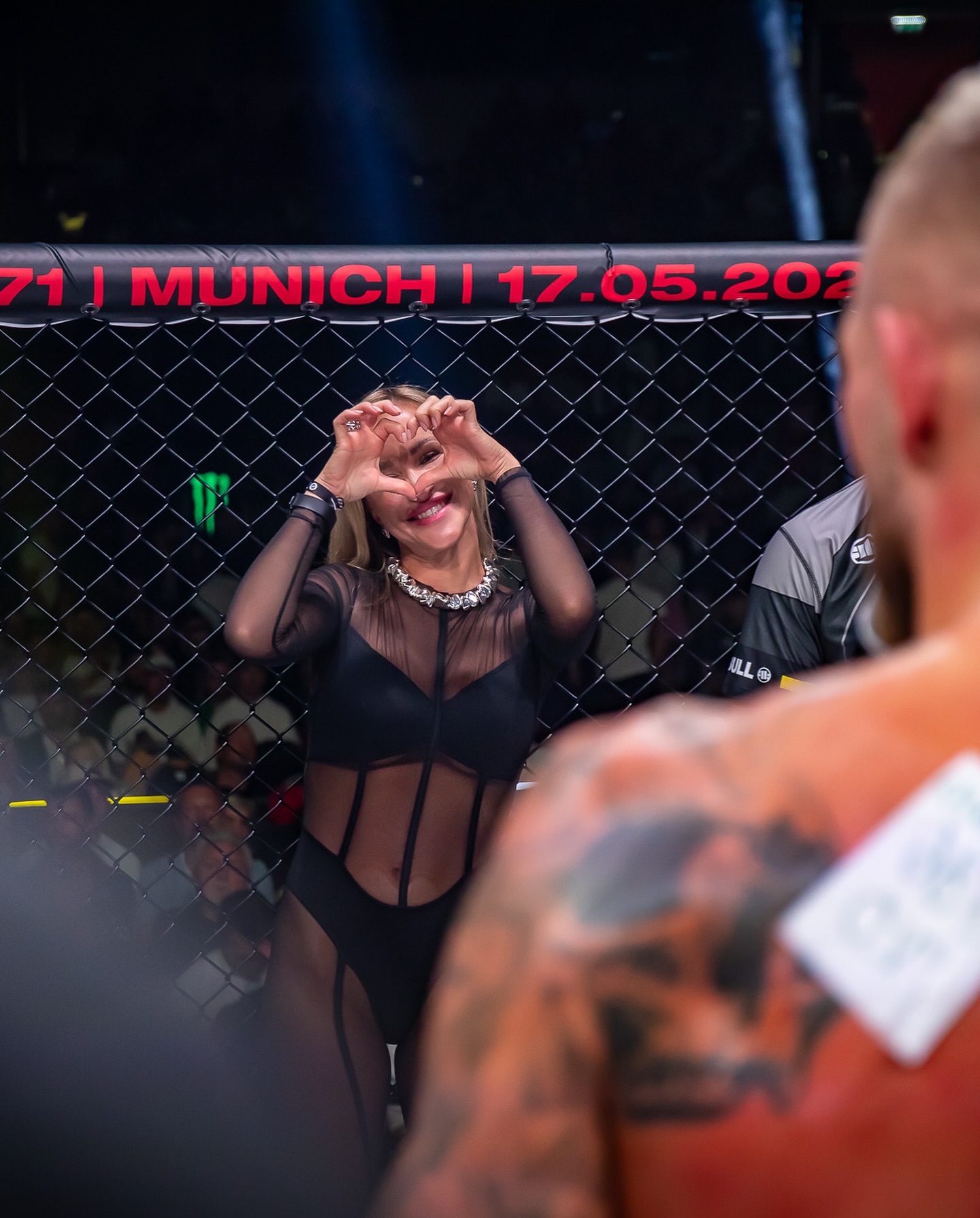 Згодната русокоса, која редовно присуствува на борбите на својата посилна половина и упорно избира провокативни изданија за навивање, па така и кон крајот на минатата година се појавила во зелен асиметричен комбинезон што целосно го открил едниот дел од нејзиното телото, а другиот го покривал. Едниот ракав го има, другиот го нема; едната ногавица ја има, другата ја нема…