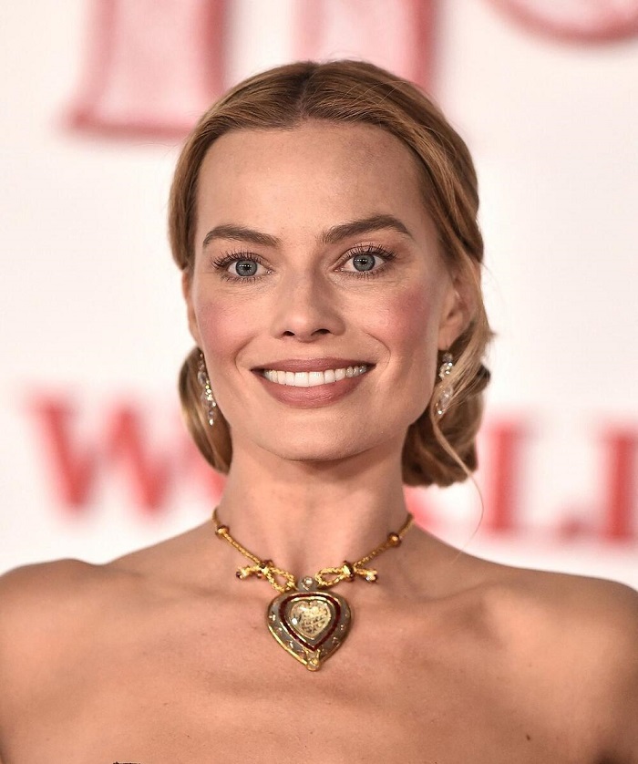 Марго Роби го искомбинира впечатливиот ѓердан со прилепена креација од модната куќа „Скјапарели“, со корсет од нежна тантела и драматичен црно-црвен долен дел налик на цветни ливчиња. Изгледот го надополни со дијамантски обетки по нарачка и прстен од „Фред Лејтон“.