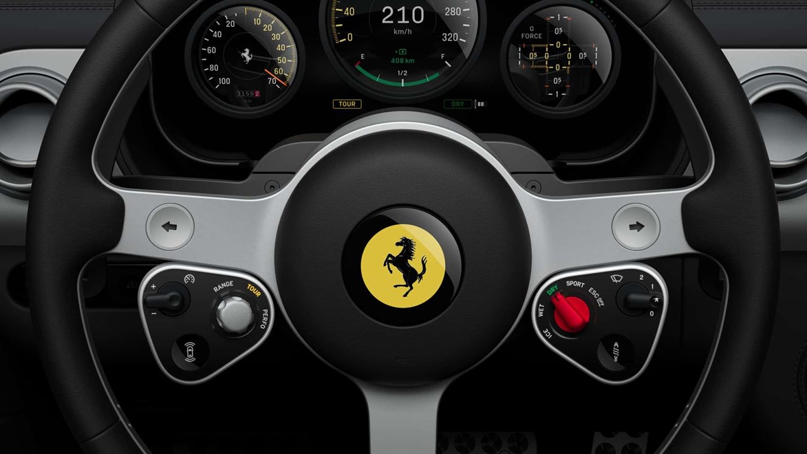 На воланот има физички команди за темпомат, избор на режим на возење, контрола на пролизгување, бришачи и адаптирање на суспензијата. „Ferrari“ наведува дека е 400 грама полесен од воланите во другите модели на компанијата.