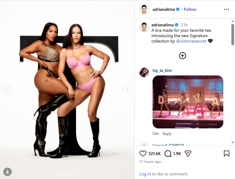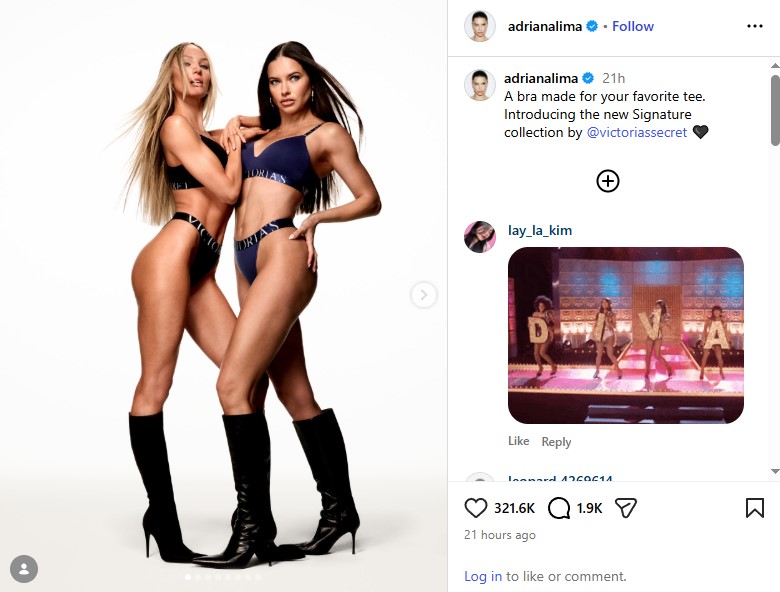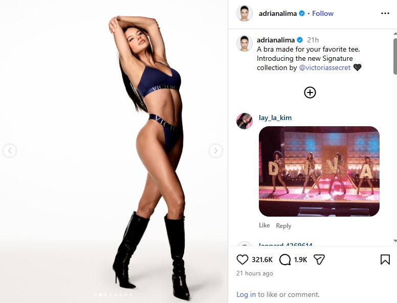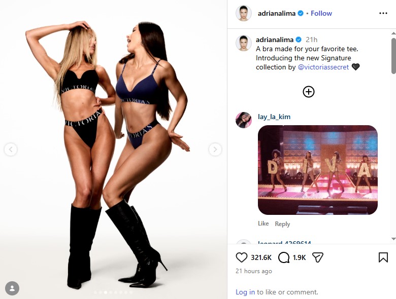 „Еднаш божица, секогаш божица“, „Легенди“, „Моите омилени манекенки“, „Така е кралице“, се само дел од коментарите под фотографиите на бразилската манекенка Адријана Лима објавени на Инстаграм. Станува збор за модна кампања на брендот „Викторија сикрет“, а соработката со него ја одбележа нејзината кариера.