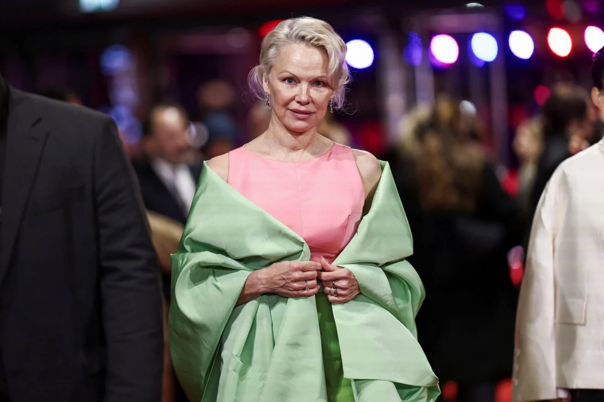 Памела Андерсон донесе боја на црвениот тепих на Берлинале каде прошета во комбинација од розова и пастелно зелена боја, и тоа на премиерата на филмот „Rosebush Pruning“.