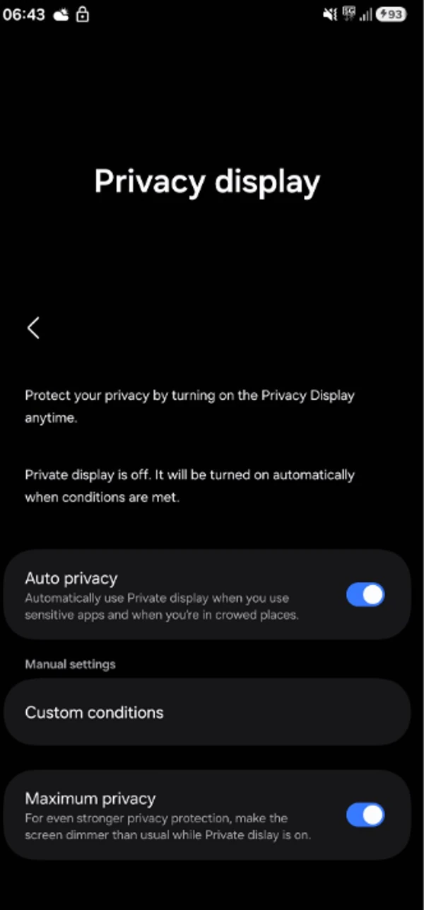 Во видеото е прикажан случај во кој целиот екран се затемнува за несакани набљудувачи кога е вклучена опцијата „Zero-peeking privacy“. Интересно е што телефонот има контрола поединечно врз пикселите, па може да затемни само известувања со чувствителни информации.