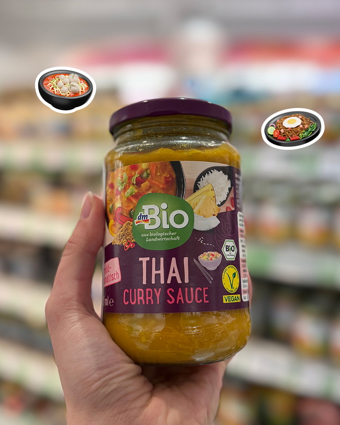 Егзотичниот dmBio таи кари сос внесува дух на тајландската кујна во секојдневното готвење. Комбинацијата од црвена и жолта пиперка, кокос, кари и ананас резултира со сочен и ароматичен сос кој одлично се вклопува со пржен зеленчук и ориз - идеален избор за брз, но впечатлив ручек или вечера.