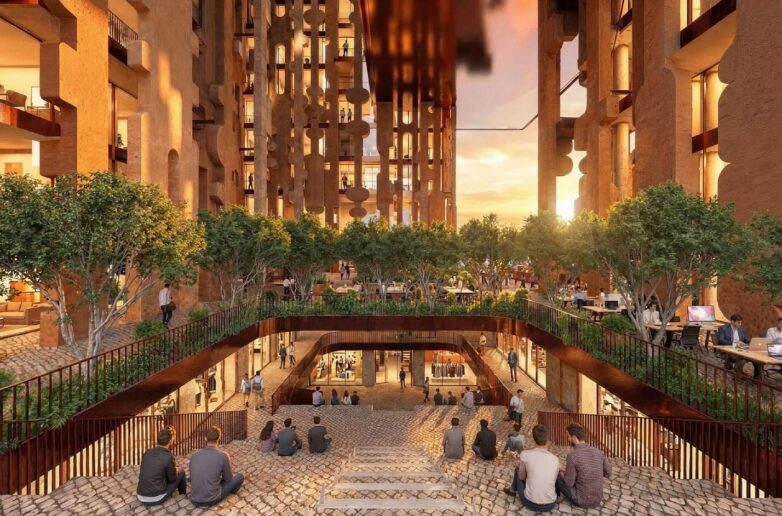 Наместо пристап од одвоени објекти, архитектите осмислиле композиција на различни висини и функција која делува како целина, со цел да се обезбеди постојана активност во текот на целиот ден.